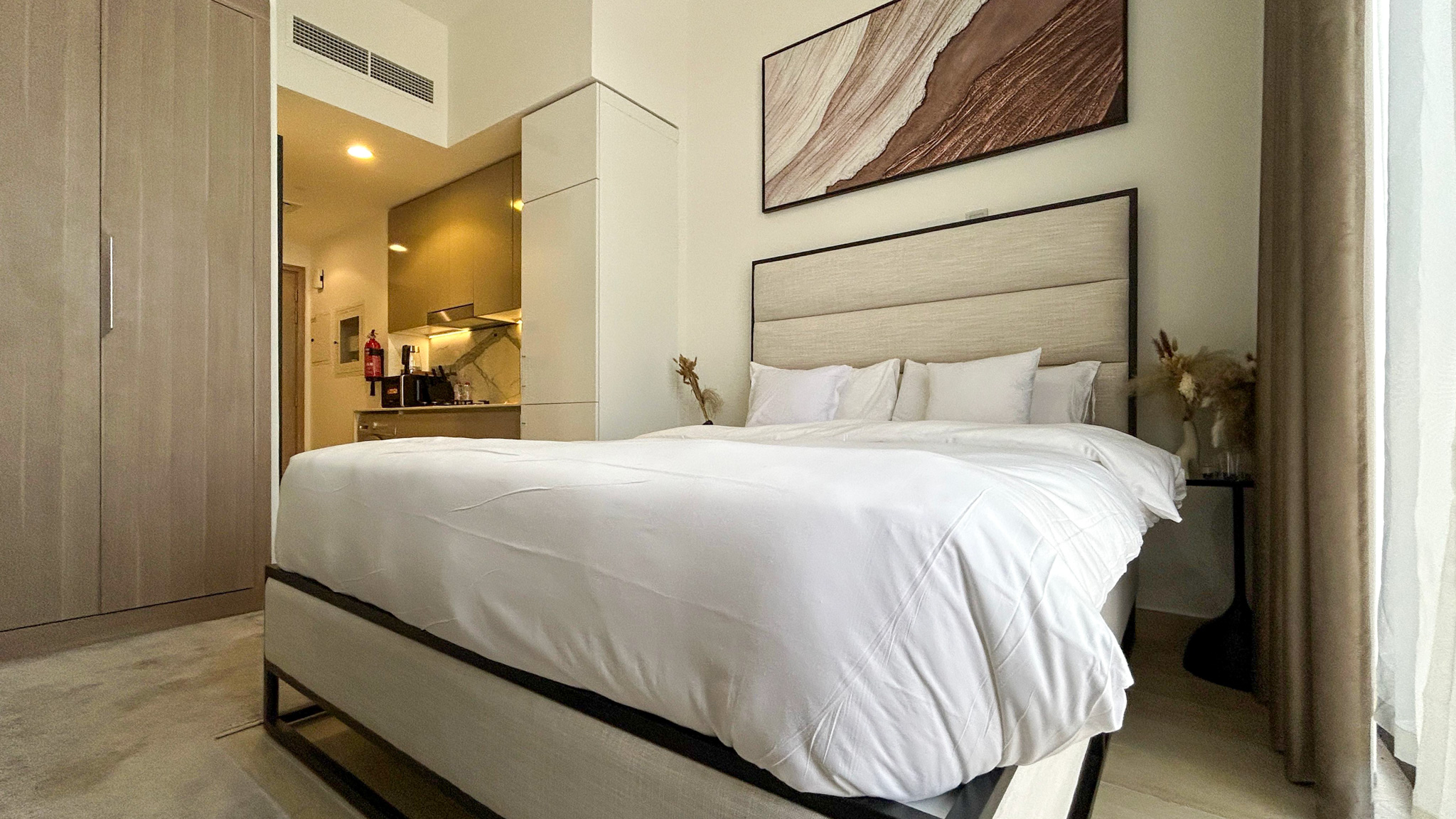 Comfortable Living Space: Relax in the cozy living area with a comfortable bed, flat-screen TV, and ample closet space.